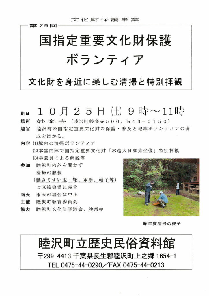 睦沢町内にある、様々な文化財を保有する「妙楽寺」の境内を清掃し、文化財を身近に感じるとともに、保護・普及することの大切さを感じてみませんか。