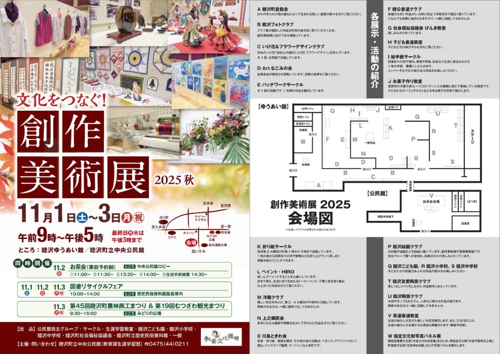 町内の文化芸術活動の発表の場として、公民館自主グループ・サークルや生涯学習教室、園・小・中・一般の作品を展示します。趣味の域を超えた素晴らしい作品や、子どもたちの想像力あふれる作品をぜひご覧ください。