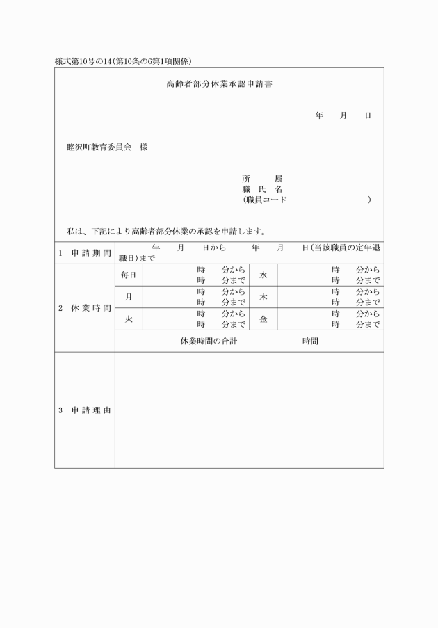 第10条の6 職員は、地方公務員法第26条の3第1項の規定による高齢者部分休業の承認を受けようとする場合は、高齢者部分休業承認申請書(様式第10号の14)を原則として高齢者部分休業を始めようとする日の3月前までに、校長を経由して教育委員会に提出しなければならない。