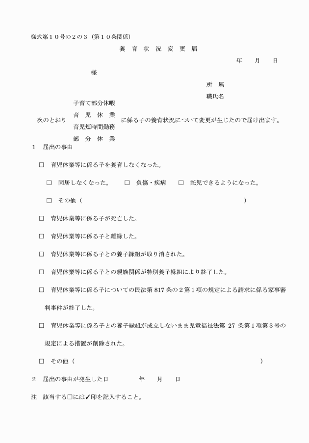 9 職員は、子育て部分休暇の期間中に、次の各号のいずれかに該当する事由が生じたときは、速やかに養育状況変更届(様式第10号の2の3)を校長を経由して教育委員会に提出しなければならない。