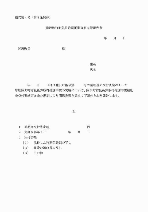第8条 補助対象者は、補助事業が完了したときは、睦沢町狩猟免許取得推進事業実績報告書(様式第4号)に狩猟免状の写し及び補助対象経費の領収書の写しを添付して、町長に提出しなければならない。