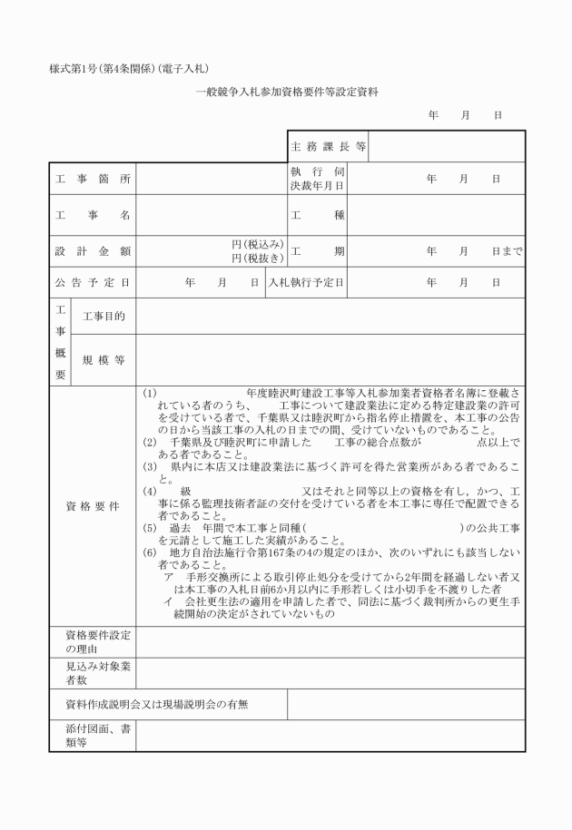 2 対象工事の施行に関する事務を分掌する課長(以下「主務課長」という。)は、一般競争入札参加資格要件等設定資料(様式第1号)を作成し、審査会に提出しなければならない。